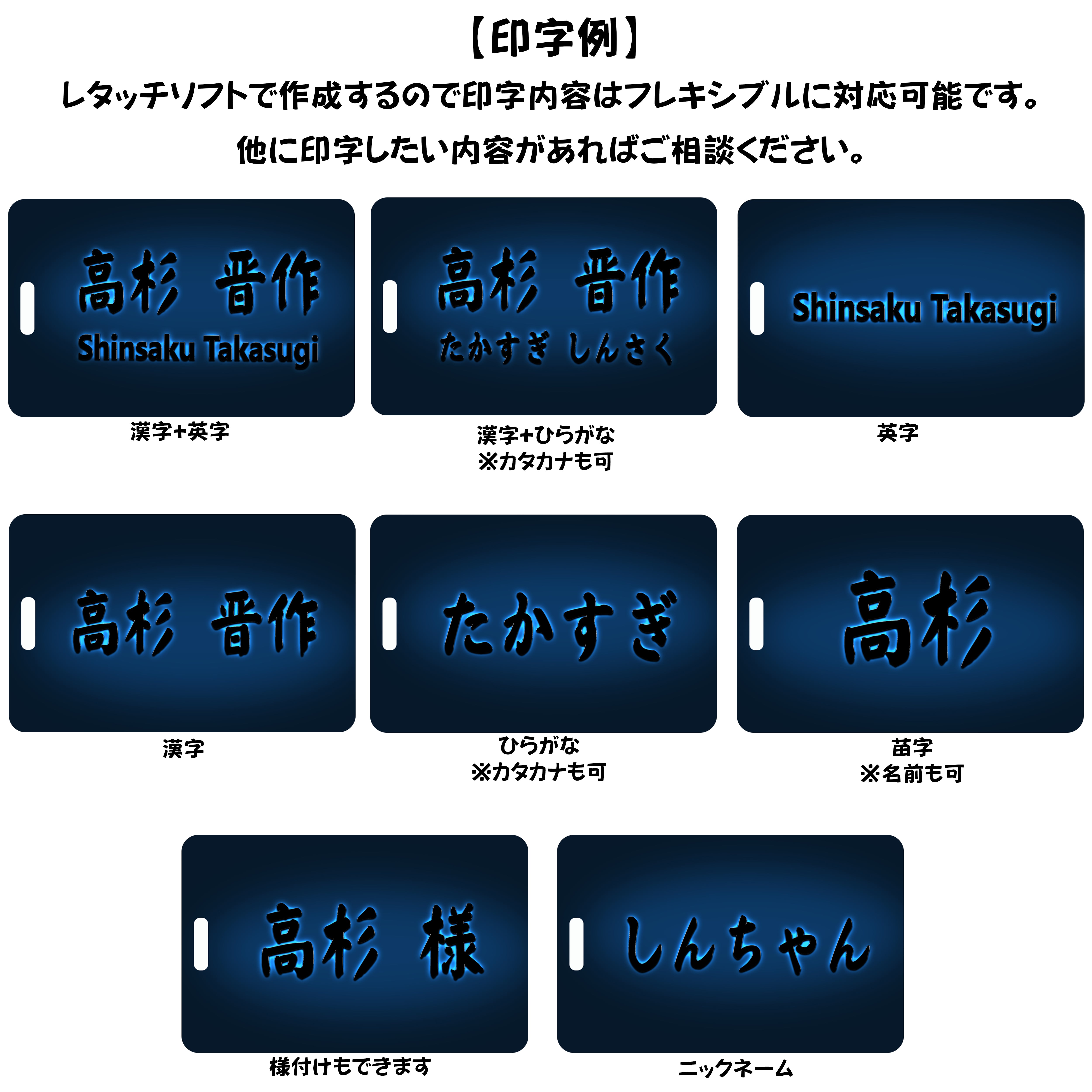 ◆レタッチソフトでBackLight (blue)風に仕上げた文字(書体データ)をプラスチックカードに印字するネームタグです